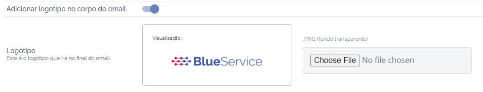 Logotipo: Ao clicar nesse campo, será possível inserir um logotipo ao final do e-mail, caso prefira, poderá incluir o logotipo padrão da Blueservice, para isso: clique em Incluir logotipo padrão ao final do e-mail, a não ser que esteja selecionado.