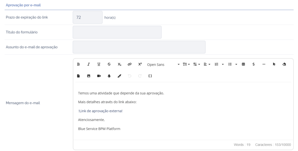 Assunto do e-mail de aprovação: Ao clicar nesse campo, será possível inserir um título breve para descrever a natureza da atividade que depende da aprovação.