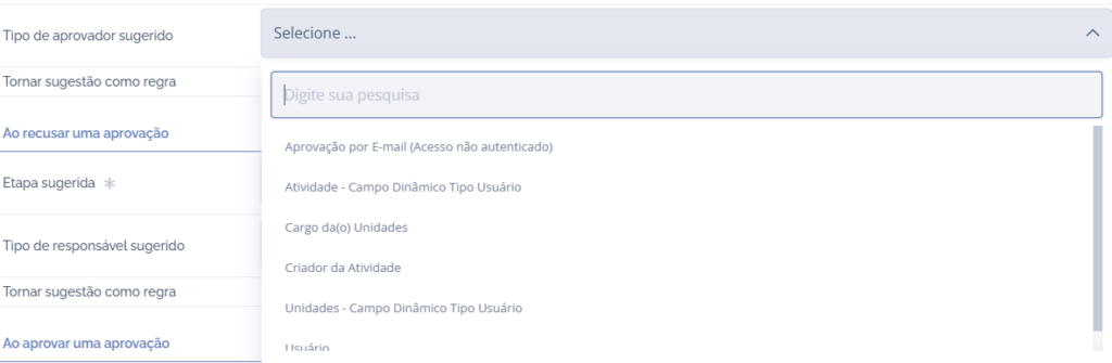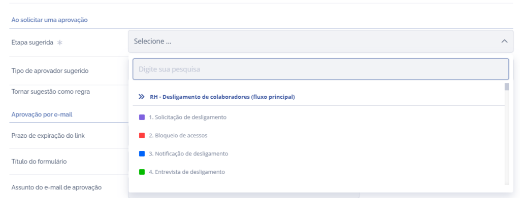 Ao solicitar uma aprovação, através do campo Etapa sugerida, será necessário selecionar a etapa desejada.