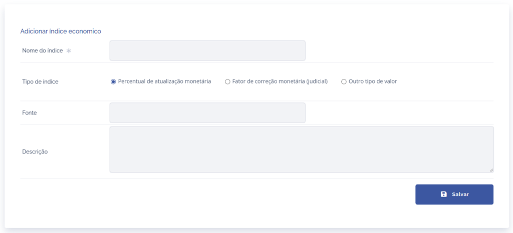 O cadastro de índices econômicos permite registrar indicadores como INPC, IPCA e outros índices financeiros, que podem ser utilizados na plataforma para consultas e cálculos de atualização monetária, conforme a configuração definida.