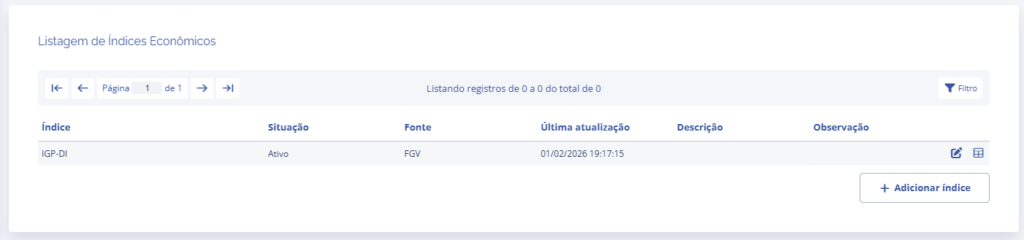 Na sequência você será redirecionado para o bloco Listagem de Índices Econômicos, podendo adicionar novos índices ao clicar no botão Adicionar índice: