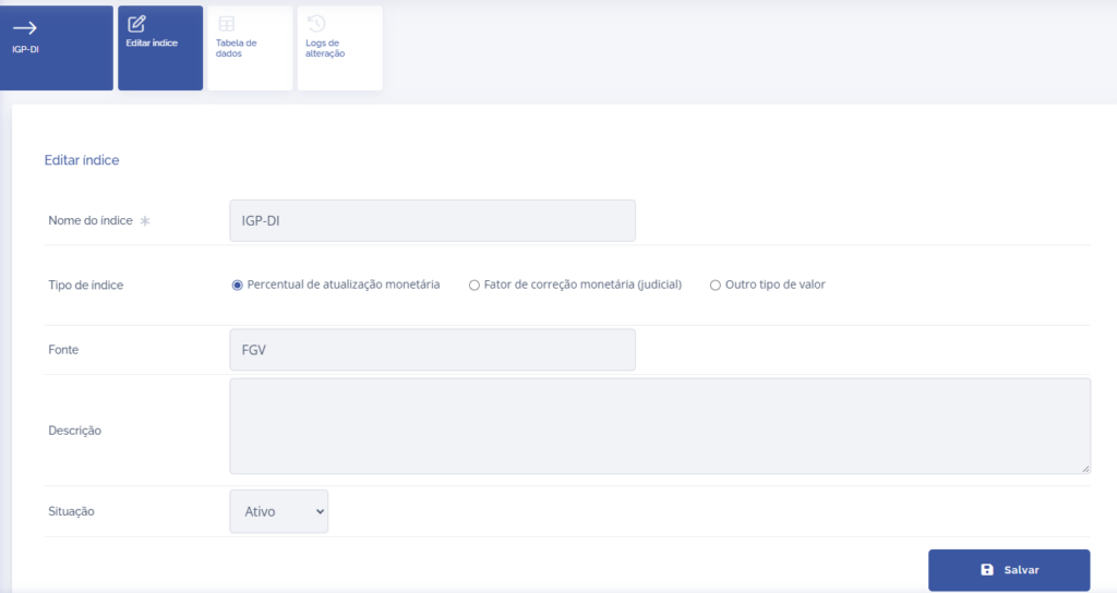 Clicando no ícone de editar, a página será redirecionada para o card de edição do índice.