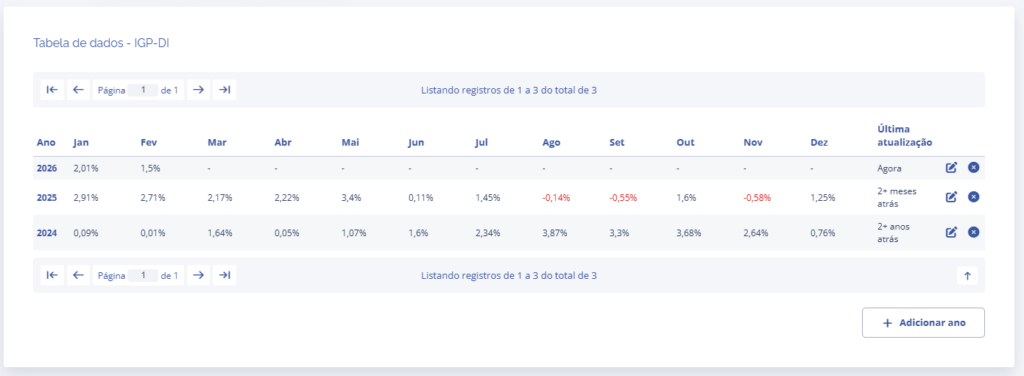 Acessando o card Tabela de dados, é possível verificar os índices anuais cadastrados no sistema e caso necessário adicionar os valores de outro ano ao clicar no botão Adicionar ano.