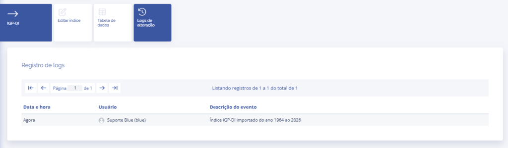 Ao clicar no card Log de alteração, é possível ver as mudanças realizadas no índice.