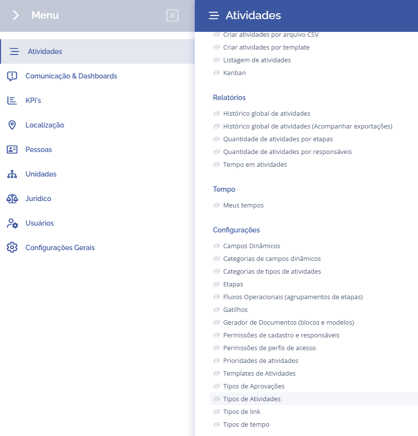 Para criar um tipo de atividade, abra o menu principal, selecione o módulo Atividades, Configurações e clique na opção Tipos de atividades.