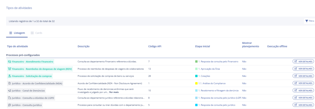 Ao preencher os campos e clicar no botão “SALVAR“, o tipo de atividade será criado e vinculado a categoria definida.