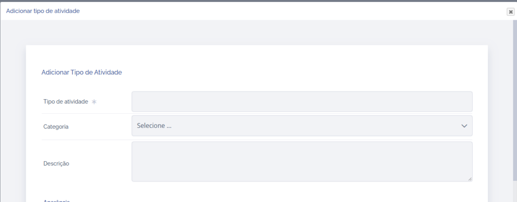 Ao clicar no botão Adicionar, será aberto o bloco Adicionar tipo de atividade: