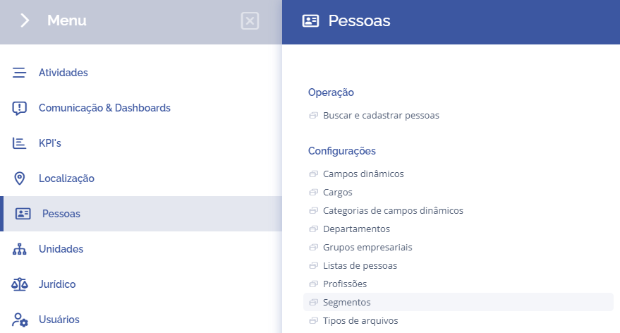 Para adicionar segmentos no sistema, abra o menu principal, selecione o módulo Pessoas, Configurações e clique na opção Segmentos.