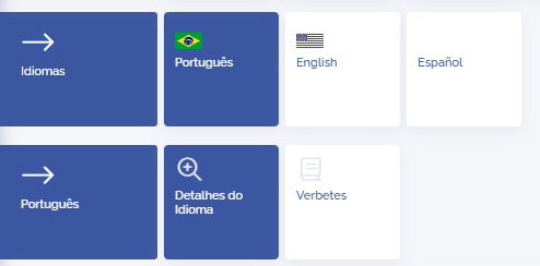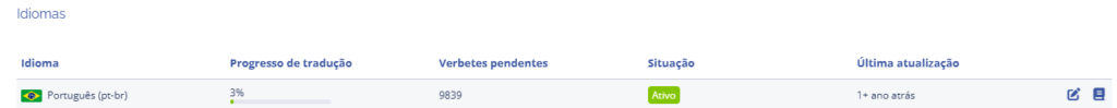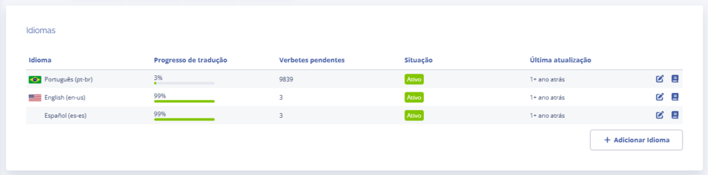 Após adicionar o idioma, é possível definir as configurações clicando no ícone editar e definir as traduções de verbetes clicando no ícone do livro da listagem.