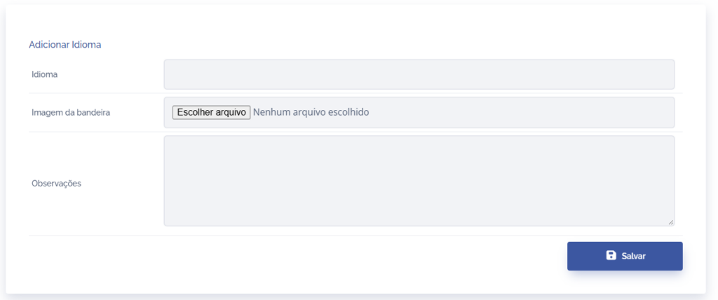 Ao clicar em Adicionar Idioma, um novo bloco de cadastro será exibido, podendo definir o nome do idioma, a imagem da bandeira e uma observação caso necessário. Clicando em Salvar o idioma será adicionado na listagem de idiomas.