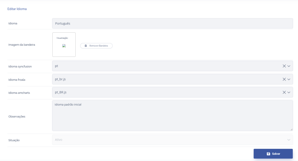 Nos detalhes do Idioma, podemos definir os parâmetros de idioma dos formulários e gráficos do sistema como o syncfusion, froala, amcharts. Para alterar a situação do idioma acesse as configurações de ativar/desativar idiomas.