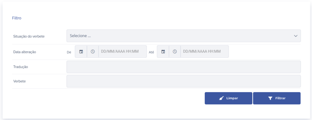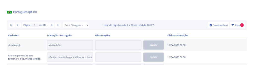 Além disso é possível realizar um download excel de todos os verbetes clicando no botão no canto superior direito da listagem e também Filtrar por verbetes traduzidos e não traduzidos, data de alteração e pesquisar por traduções/verbetes específicos.