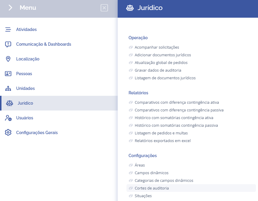 Para criar cortes de auditoria, abra o menu principal, selecione o módulo Jurídico, Configurações e clique na opção Cortes de auditoria.