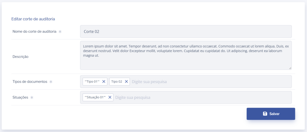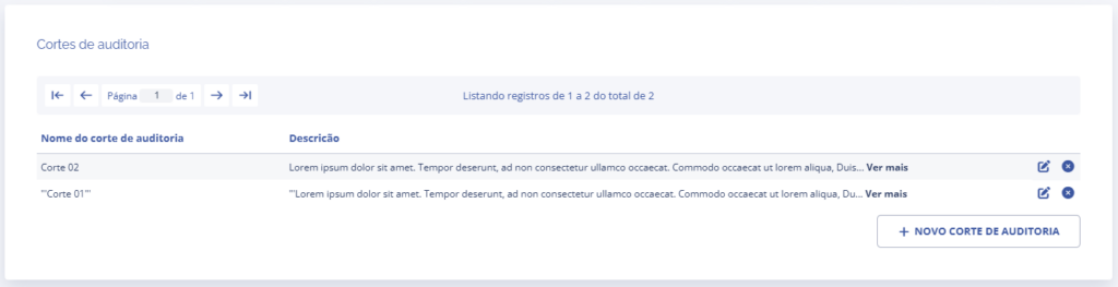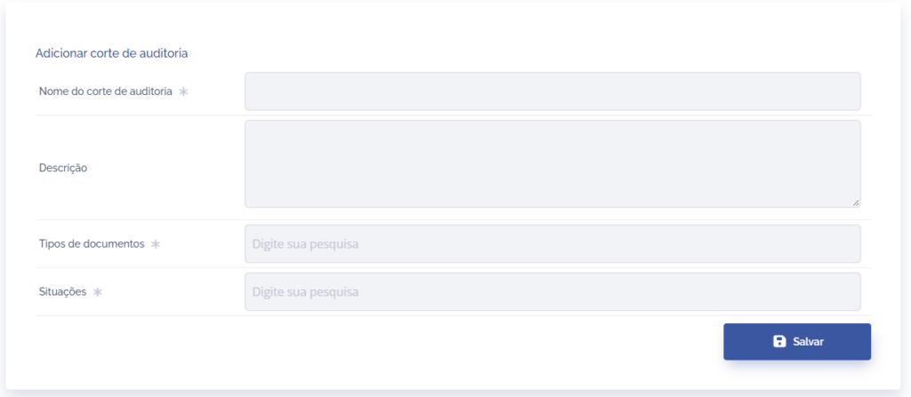 Ao clicar no botão Novo corte de auditoria, será exibido um novo bloco para adicionar o corte:
