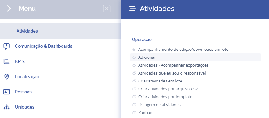 O formulário de criação de atividades é a forma mais simples de se criar uma atividade na plataforma. Para acessá-lo, abra o menu principal, selecione o módulo Atividades, Operação, e clique na opção Adicionar.