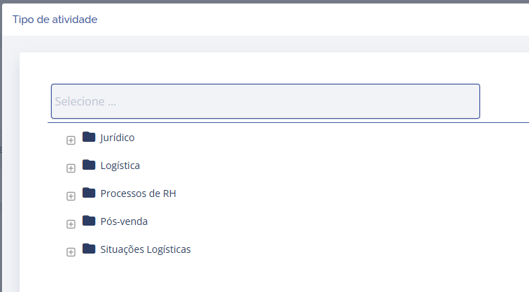 Será aberta uma janela com os tipos de atividades disponíveis, organizados em categorias. É possível localizar um tipo específico utilizando a caixa de busca, ou então explorando as categorias e sub-categorias: