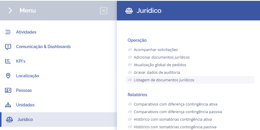 Para acessar a gravação, abra o menu principal, selecione o módulo Jurídico, Operação e clique na opção Listagem de documentos jurídicos.