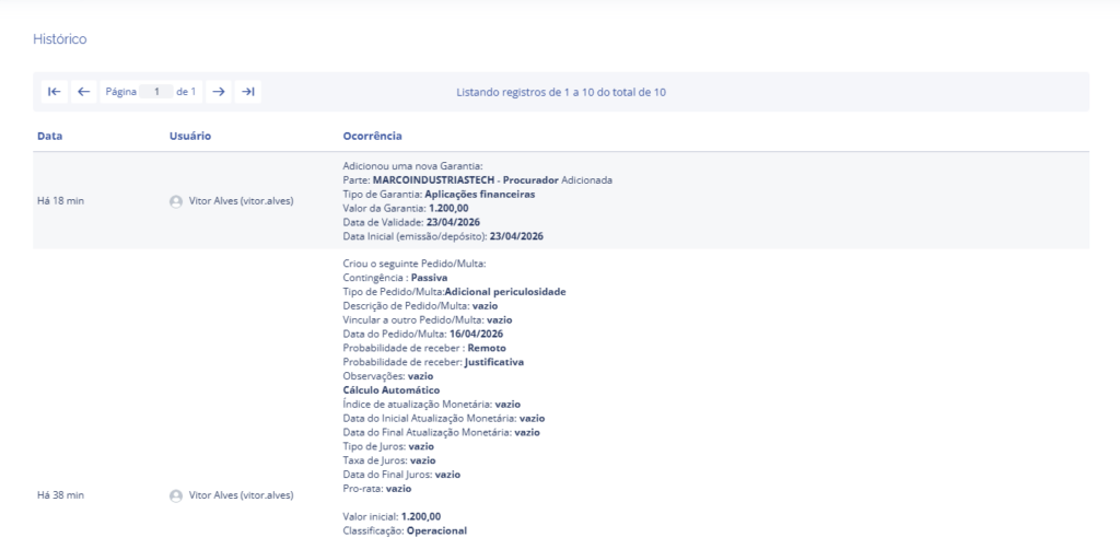 Neste bloco é exibido todo o histórico do documento após sua criação: