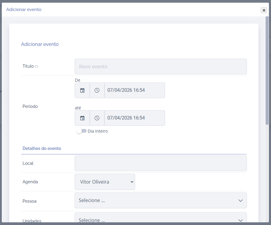 Ao clicar no botão Adicionar evento, o sistema abrirá uma janela flutuante.