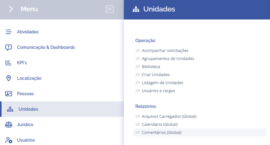 Para acessar o relatório dos eventos registrados por unidade, abra o menu principal, selecione o módulo Unidades, Relatórios e clique na opção Comentário (Global).