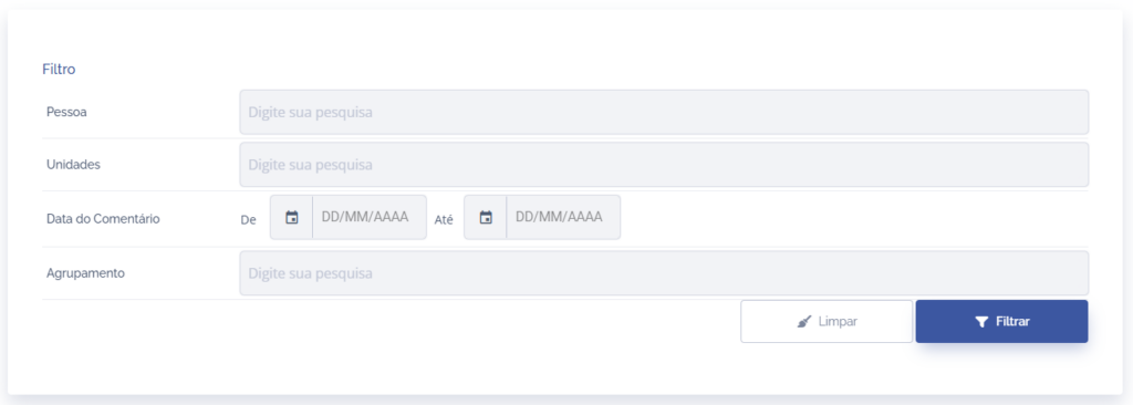 Caso necessário, o sistema permite procurar um comentário específico, clicando no botão Filtrar da listagem.