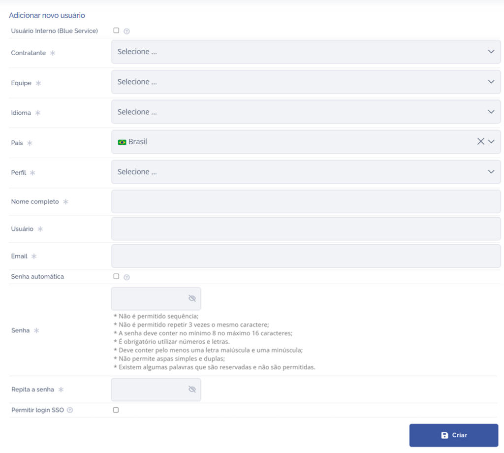 Após preencher os campos, clique no botão Criar para finalizar a criação do usuário.