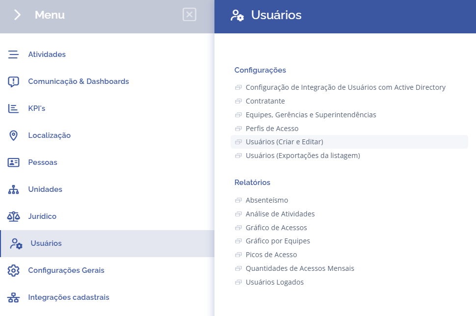 Para acessar a listagem de usuários, abra o menu principal, selecione o módulo Usuários, Configurações e clique na opção Usuários (criar e editar)