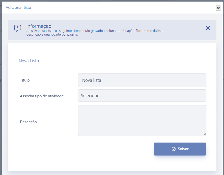 Nesta janela, é necessário definir um título para a nova lista. Caso necessário, é possível associar tipos de atividade específicos e colocar uma descrição, caso queira descrever brevemente a função da nova lista. Após isso, clique no botão “Salvar” para salvar as configurações realizadas.