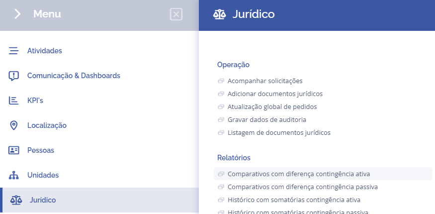 Para acessar o comparativo com diferença (contingência ativa), abra o menu principal, selecione o módulo Jurídico, Relatórios, e clique na opção Comparativos com diferença contingência ativa.