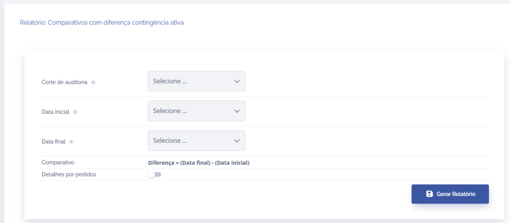 O relatório de comparativos com diferença (contingência ativa) é uma funcionalidade que permite comparar os valores de pedidos entre duas datas de corte de auditoria. O objetivo é identificar a variação dos valores ao longo do tempo, considerando apenas pedidos classificados como contingência ativa.