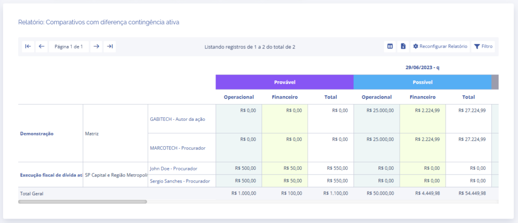 Em seguida, será exibido o bloco (Relatório: Comparativos com diferença contingência ativa):