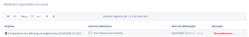 Acessando o link da janela flutuante, o sistema redirecionará para a página de Relatórios exportados em excel, podendo visualizar a solicitação e baixá-lo após concluir o processamento.