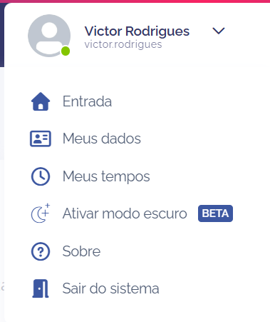 Para visualizar os documentos aceitos, abra o menu do usuário no canto superior direito e clique na opção Meus dados