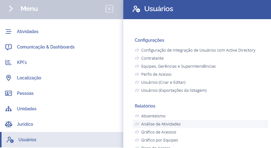 Para verificar o relatório de absenteísmo, é necessário acessar Usuários > Relatórios > Análise de atividades: