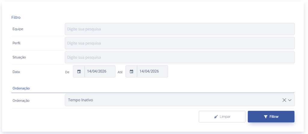 Ao clicar no botão Filtro, o sistema permite adicionar outros parâmetros, podendo adicionar uma visão por equipe, perfil, situação do usuário (ativo/bloqueado), data e qual tipo de ordenação da listagem.