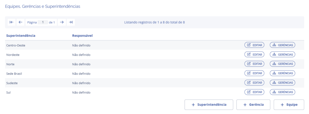 Para criar equipes, gerências e superintendências, abra o menu principal, selecione o módulo Usuários, Configurações e clique na opção Equipes, gerências e superintendências.